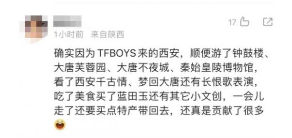 ▲截图来源:西安发布有网友称,为了TFBOYS来西安,顺便游了钟鼓楼大唐芙蓉园、大唐不夜城、秦始皇陵博物馆,看了西安千古情、梦回大唐还有长恨歌表演,吃了美食,买了蓝田玉还有其它小文创,还要买点特产带回去。