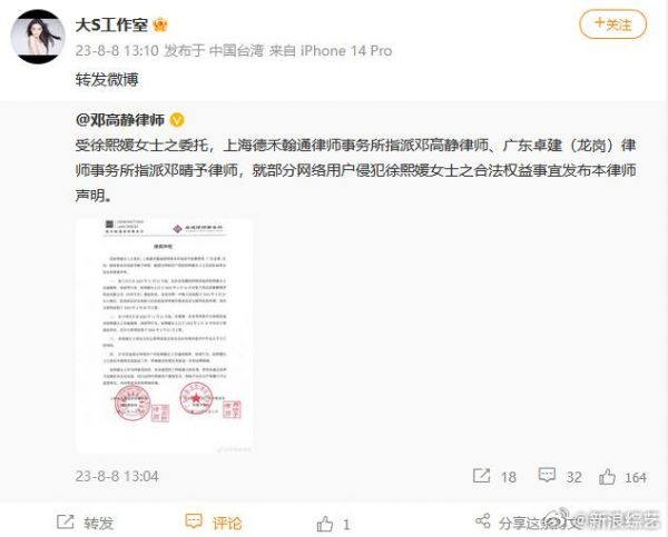 8日,大S工作室通过律师发声明……