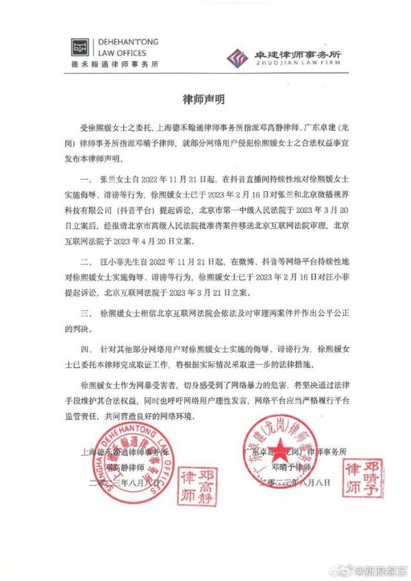 #大S工作室发律师声明# 8日,大S工作室通过律师发声明,称张兰、汪小菲在网络平台对大S实施侮辱、诽谤等行为,大S已于2月16日起诉,北京互联网法院4月20日立案。针对其他部分网络用户的侵权行为,大S已委托律师完成取证工作,呼吁大家理性发言。