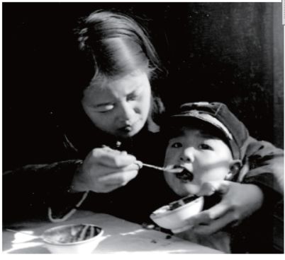 路边小摊儿,一位妈妈正在喂孩子吃东西。美味的小吃,成为许多北京人的童年记忆。