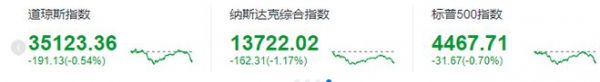 道琼斯指数收于35123.36点,下跌191.13点,跌幅0.54%;标准普尔500指数收于4467.71点,跌幅0.70%;纳斯达克指数收于13722.02点,跌幅1.17%。