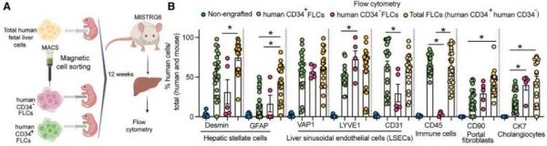 在论文中,研究人员详细描述了他们让小鼠长出“人源化肝脏”的方法。这颗肝脏主要来源于人类肝脏的祖细胞(干细胞)和成熟细胞(肝细胞),发育成熟后再现了人类肝脏的结构,与体型的相对大小更接近健康人的肝脏。更重要的是,其细胞功能与人类肝脏细胞十分相似,不仅可以执行具有人类特征的代谢和稳态过程,还可以用来模拟在人类非酒精性肝病和肝纤维化中发生的变化。