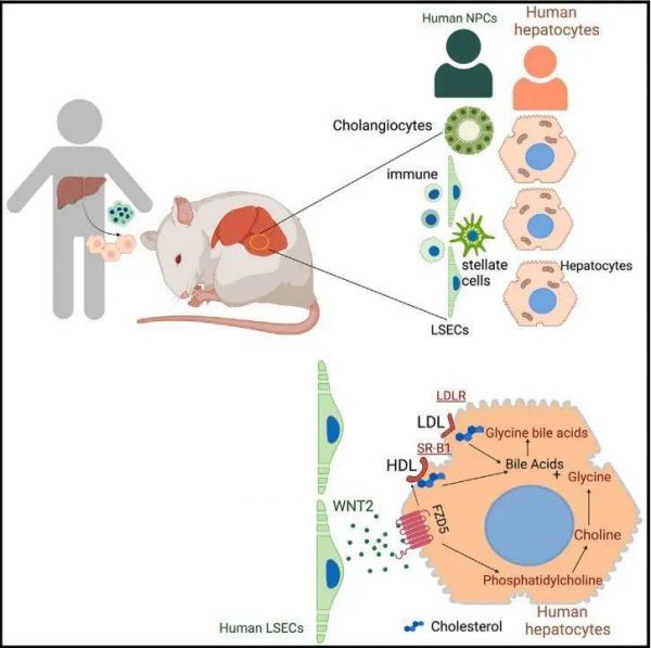这些内皮细胞位于为肝脏供血的血管。研究人员发现,它们通过人类特有的旁分泌机制控制着胆固醇向肝细胞的运送。具体来说,它们会分泌出一种名为WNT的信号分子,而人类肝细胞通过特异性受体FZD5接收这一WNT信号,然后调控胆固醇摄取、胆汁酸合成等一系列代谢功能。