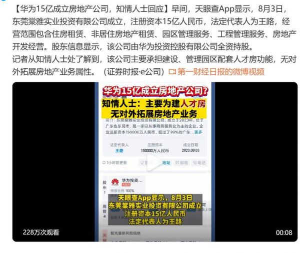 日前,华为投资控股有限公司全资持股成立了东莞棠雅实业投资有限公司,这家公司注册资本15亿人民币,经营范围包含住房租赁、非居住房地产租赁、园区管理服务、工程管理服务、房地产开发经营。