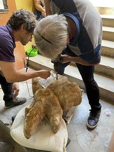 研究者在P. colossus的骨骼上钻孔研究其密度和内部结构。来源:Giovanni Bianucci
