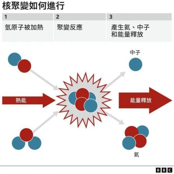 核聚变反应与太阳和其他恒星释放能量的原理相同,因此被科学界称为“小太阳”,也被喻为能源领域的“圣杯”(holy grail)。具体来说,就是两个较轻的原子(例如氘和氚)结合成较重的原子核(例如氦)和一个很轻的核(或粒子)的一种核反应形式,在这个过程中会释放出巨大的能量。