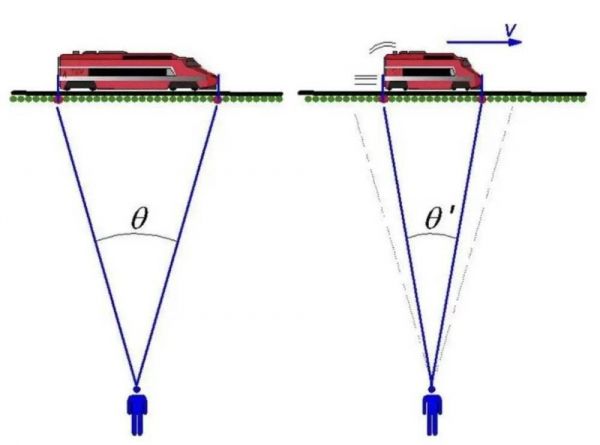 或者,就像在爱因斯坦的相对论中经常出现的情况一样,想象两位分别拥有时钟的观察者:一位在地面上,一位在移动的火车上。可以用两种不同的视角来等价地描述这一现象:让地面处于“静止”状态,火车上的观察者在运动中经历时间膨胀和长度收缩的效应;亦或是令火车处于“静止”状态,地面上的观察者经历时间膨胀和长度收缩的效应。