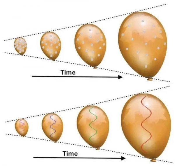 当气球充气时,粘在其表面的硬币看起来相互远离,“距离更远”的硬币比距离较近的硬币远离得更快。任何光线都会发生红移,与气球的膨胀类似,光的波长会被“拉伸”到更大的值。这个图像很好地解释了宇宙的红移。图源:E. Siegel/Beyond the Galaxy