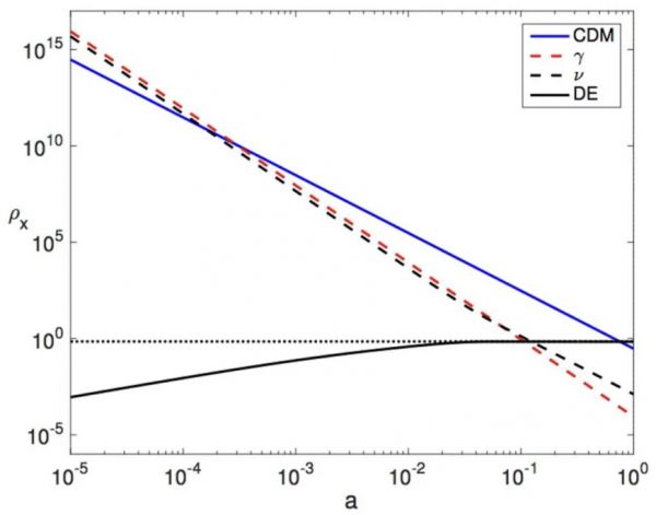 光子辐射密度(红色)、中微子密度(黑色虚线)、物质密度(蓝色)和暗能量密度(点线)随时间变化的示意图。几年前提出的一种新的模型中,暗能量被替换为图中的黑色实线,该曲线在观测上与我们假设的暗能量目前是不可区分。截至2023年,处于膨胀宇宙中的暗能量在状态方程中可以与“常数”相差约7%;更多的差异受到数据的严格限制。图源:F. Simpson et al., Physics of the Dark Universe, 2018