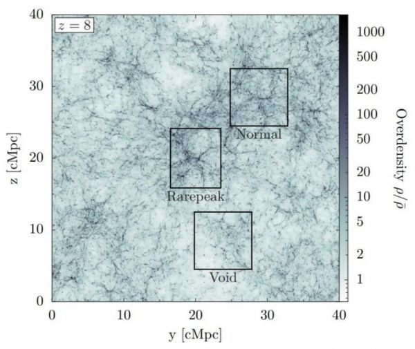 典型的或“普通”过密区域将逐渐形成丰富的结构,而密度较低的“Void”区域则结构较少。然而,早期的小尺度结构主要由密度最高的区域(在此标记为“Rarepeak”)主导,这些区域增长最快,只有在最高分辨率的模拟中才能观测到细节。图源:J. McCaffrey et al., Open Journal of Astrophysics (submitted), 2023