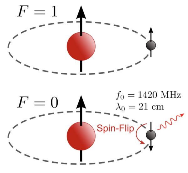 氢原子形成时,电子和质子的自旋平行和反平行有同等的概率。如果它们是反平行的,就不会发生进一步的跃迁,但如果它们是平行的,它们可以通过量子隧道进入较低能态,在相当长的时间尺度发射出特定波长的光子。这种跃迁测量的精确性已能达到万亿分之一,且在数十年内保持不变,这就限制了普朗克常数、光速、电子质量及它们的组合。图源:Tiltec/Wikimedia Commons