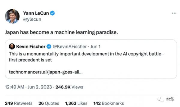 日本政府推动人工智能数据训练的积极态度已经超过英国和欧盟,后者的合理使用排除非法获取,而日本甚至将从非法网站获取予以划出从而缩小非法获取的范围。难怪顶尖人工智能专家Yann LeCun在推特评价日本已经成为机器学习的天堂。