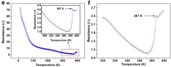 比如说,最早复现磁悬浮的华中科技大学团队在arXiv公布的论文结果表明,除了在387K(即114℃)有一个小的跳变外,样品的电阻基本随温度升高而逐渐降低,但并没有降低到零,整体呈现出半导体的特征。