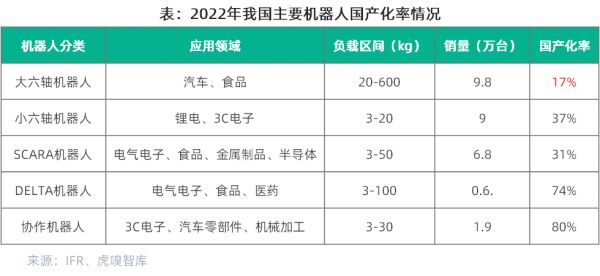 根据IFR数据,我国2022年大六轴机器人的国产化率仅为17%,远低于其他类型机器人。在迈向国产化的路径中,产品性能要不断精进,由小规模走向大体量,由低端走向高端,大六轴机器人的国产替代势在必行。