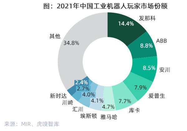 根据MIR数据,2021年四大家族仍牢牢占据我国工业机器人市场份额前四名,合计市场份额约40%。尽管国产份额由2015年的18%提升至2021年的33%,但集中度较为分散且暂未出现头部企业。