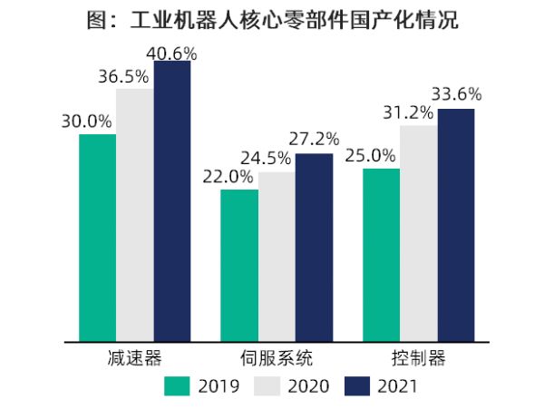 数据显示,工业机器人上游三大件国产化率近些年均有不同程度地上升,但国外厂商依旧占据一半以上的市场份额。具体来看,减速器的国产化率较高,且每年的渗透幅度也最为明显,而伺服系统国产化进程表现较差。