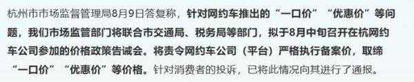 小通从澎湃新闻了解到,杭州市市场监督管理局将联合相关部门,拟于8月中旬召开价格政策告诫会,责令网约车公司(平台)严格执行备案价,取缔“一口价”“优惠价”等价格。