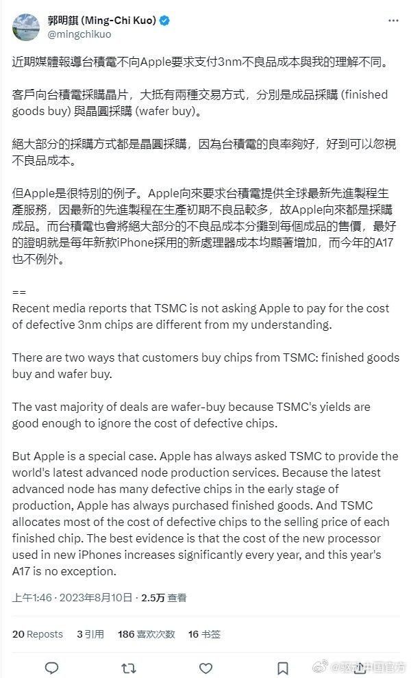 【郭明錤不认可“甜心交易”报道:#苹果按成品方式采购台积电芯片# 】