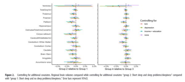 研究人员利用HCP、UKB、BASE-II等多个项目的数据,探究了睡眠时长与大脑体积及认知功能的关系,发现睡眠时间短且无睡眠问题及白日嗜睡的情况下,大脑体积更大;但睡眠时间短的人,其认知能力略低。