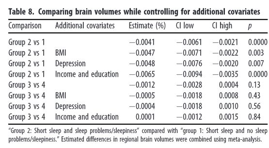 为了控制以上变量对实验结果的影响,他们重做了主要的分析(第一组和第二组;第三组和第四组),发现并不影响主要的结论,尽管各组间的BMI、抑郁程度、受教育水平有所不同,但是并不能足以解释各组间大脑体积的差异。