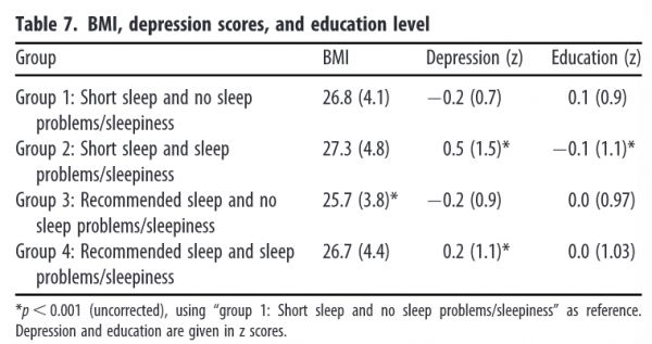 接着,他们通过GCA来比较各组之间的认知功能差异。在睡眠时间短的两组之间(第一组和第二组)认知功能没有显著性的差别。而第四组的认知能力显著低于第三组。而第一组和第二组的认知能力测试都低于第三组。