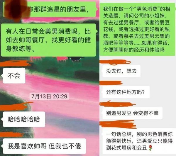 上个月,我问起小C男色消费的问题,我指的是追星之外的男色消费,比如去猛男餐厅吃饭,选择更好看的私教等。她不屑地在微信上回复我,“我是喜欢帅哥,但我也不傻”。
