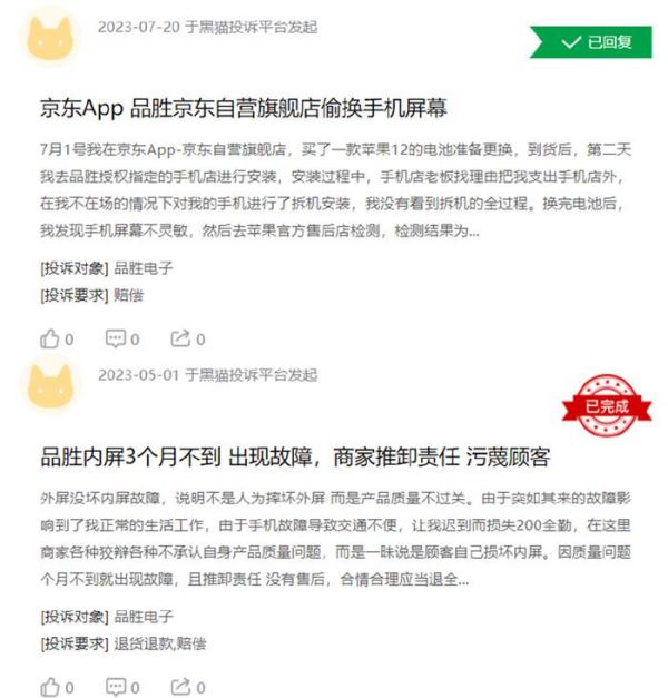 有消费者表示,其在品胜电子指定的维修店更换手机屏幕后,仅三个月屏幕就再次失灵,还有更换电池导致屏幕损坏,更换后的电池鼓包,甚至是屏幕被调换等。