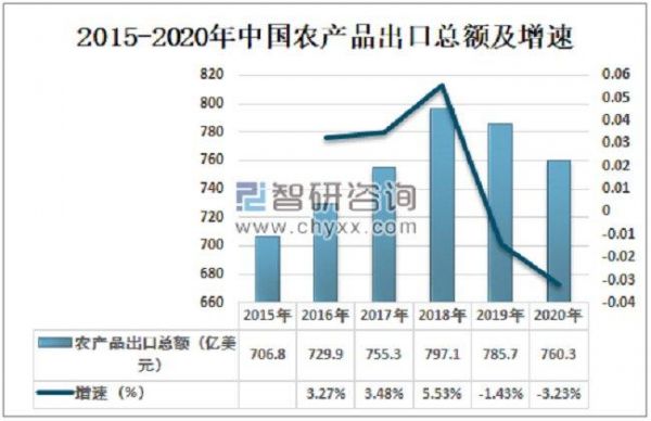 图示:2015-2020年中国农产品出口总额及增速 资料来源:海关总署