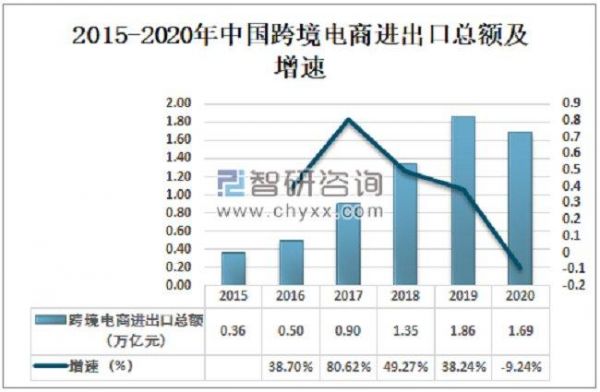 图示:2015-2020年中国跨境电商进出口总额及增速(资料来源:海关总署、智研咨询整理)