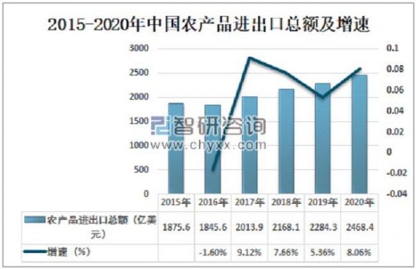 图示:2015-2020年中国农产品进出口总额及增速资料来源:海关总署