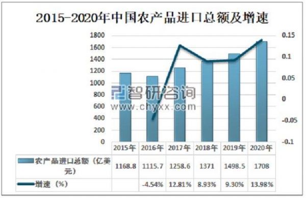 图示:2015-2020年中国农产品进口总额及增速资料来源:海关总署