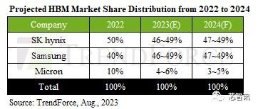 SK海力士目前在HBM3生产方面处于领先地位,是英伟达服务器GPU的主要供应商。另一方面,三星正专注于满足其他CSP的订单。由于CSP对三星的订单数量不断增加,预计今年三星和SK海力士之间的市场份额差距将大幅缩小。预计这两家公司将在2023年至2024年的某个时候在HBM市场上拥有相似的份额,合计约占95%的市场份额。然而,由于不同的客户群,不同季度的出货表现可能会有所不同。美光目前主要专注于HBM3e的开发,由于SK海力士和三星这两家韩国制造商的积极扩张计划,美光未来两年的市场份额可能会略有下降。