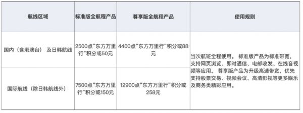 乘客可以使用积分兑换或直接购买东方航空的上网服务。国内航线(包括日韩线)标准版的价格是50元,国际航线标准版的价格则是150元。
