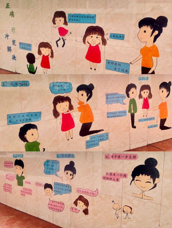 育彤幼儿园墙上画着的解决冲突六步骤。摄:张楠茜