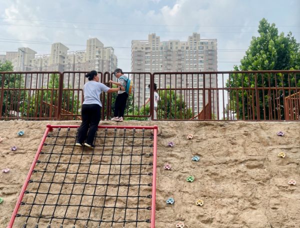 2023年6月,郑州市奇色花幼儿园,老师正在辅助一位特殊孩子下斜坡。摄:张楠茜