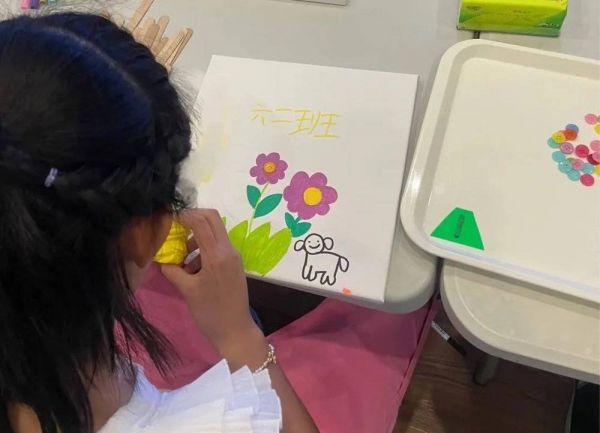 阳阳正在画画,她擅长画猫,不过这天画了个小狗。摄:张楠茜