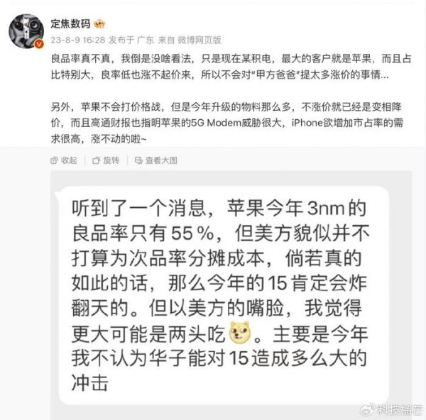 另外,该爆料人还认为,今年华为Mate 60系列应该不会对iPhone 15系列造成多大的冲击,如果华为的冲击够大,苹果也有资本打价格战。言外之意就是,iPhone 15系列有很大的降价空间。对此,数码大V@定焦数码评论称,苹果应该不会与华为打价格战,这次iPhone 15系列升级幅度非常大,不涨价已经是变相降价,竞争力很强。而且苹果如果要提高市场占有率,大概率也是不涨价的。