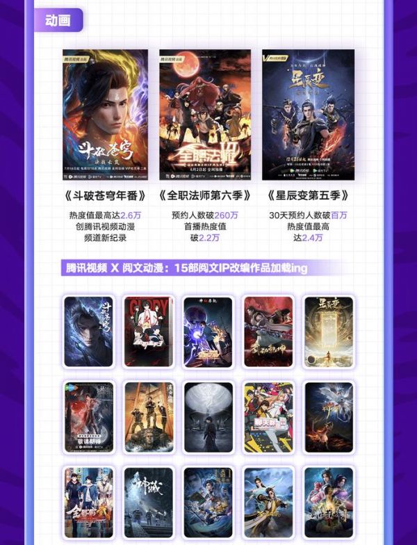 在动画领域,2023年上半年阅文推出了经典IP《星辰变》和《全职法师》的续作,持续收获好评。7月,《斗破苍穹》年番系列的第一季完结,阅文顺势推出了第二季年番,让该IP的热度始终维持在腾讯视频动漫频道的前三名,其热度值最高达到2.6万,并打破了腾讯视频动漫频道热度值纪录。此外,在日前腾讯视频动漫大赏2023年度发布会上,阅文动漫一口气公布了《斗破苍穹年番三》《诡秘之主》《全职高手S3》等15部作品的动画计划,受到粉丝们的热情期待。