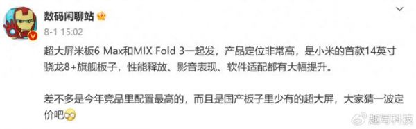 除了手机产品以外,发布会大概率还会发布一台平板产品,不过各位先收起好奇心,因为这次不是新的小米平板7,也不是此前传闻已久的小米平板mini,而是超大屏的小米平板6 Max。别的特点没有,就突出一个大,屏幕直接暴涨到14英寸,和一台普通的笔记本电脑差不多大了。