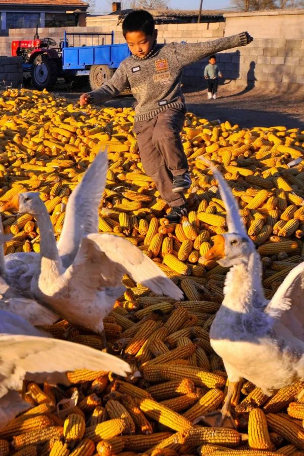 秋收时节,在玉米上扑腾的小孩和大鹅。