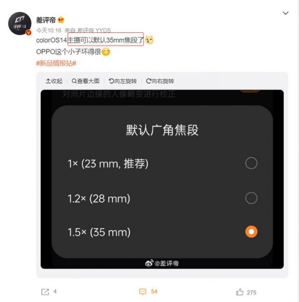 值得一提的是,有行业内人士爆料称,国产手机系统的大战其实才刚刚开始,因为接下来OPPO的ColorOS 14系统,从8月份开始可能也会陆续推送更新。而目前关于ColorOS 14系统的新功能爆料也不少,其中数码博主「差评帝」就发动态表示“ColorOS 14主摄可以默认35mm焦段了”,可见新系统对相机功能进行了优化,让主摄可以根据个人喜好去设置三种叫焦段,对于摄影迷来说无疑是一个惊喜。