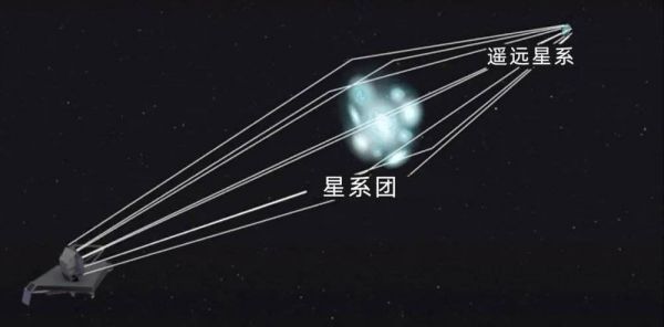 质量可以让空间本身弯曲,这是爱因斯坦的广义相对论最令人惊奇的预言之一。当遥远天体发出的光在宇宙中传播时,如果光经过了一个大质量物体(比如星系团),光的路径就会发生弯曲。