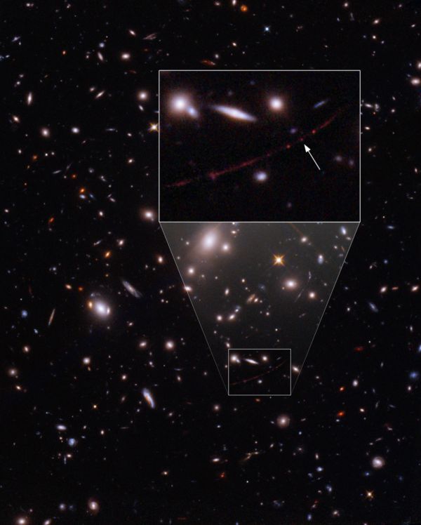 哈勃空间望远镜和韦布空间望远镜之所以能探测到埃兰迪尔,正是运用了引力透镜效应。它们幸运地瞄准了一个大质量星系团WHL0137-08。这个位于地球和埃兰迪尔之间的星系团扭曲了周围的空间结构,产生一种放大效应,使天文学家能够像透过一个放大镜那样透过这个星系团进行观测。