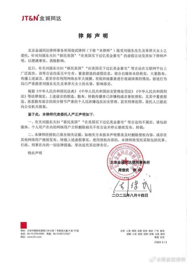 8月14日消息,今日晚间,京东发布声明表示,近日,有关刘强东章泽天夫妇 “移民美国”“在美国买下过亿美金豪宅〞等言论在互联网平台上广泛流传。该等言论均系无中生有、蓄意捏造的虚假信息。