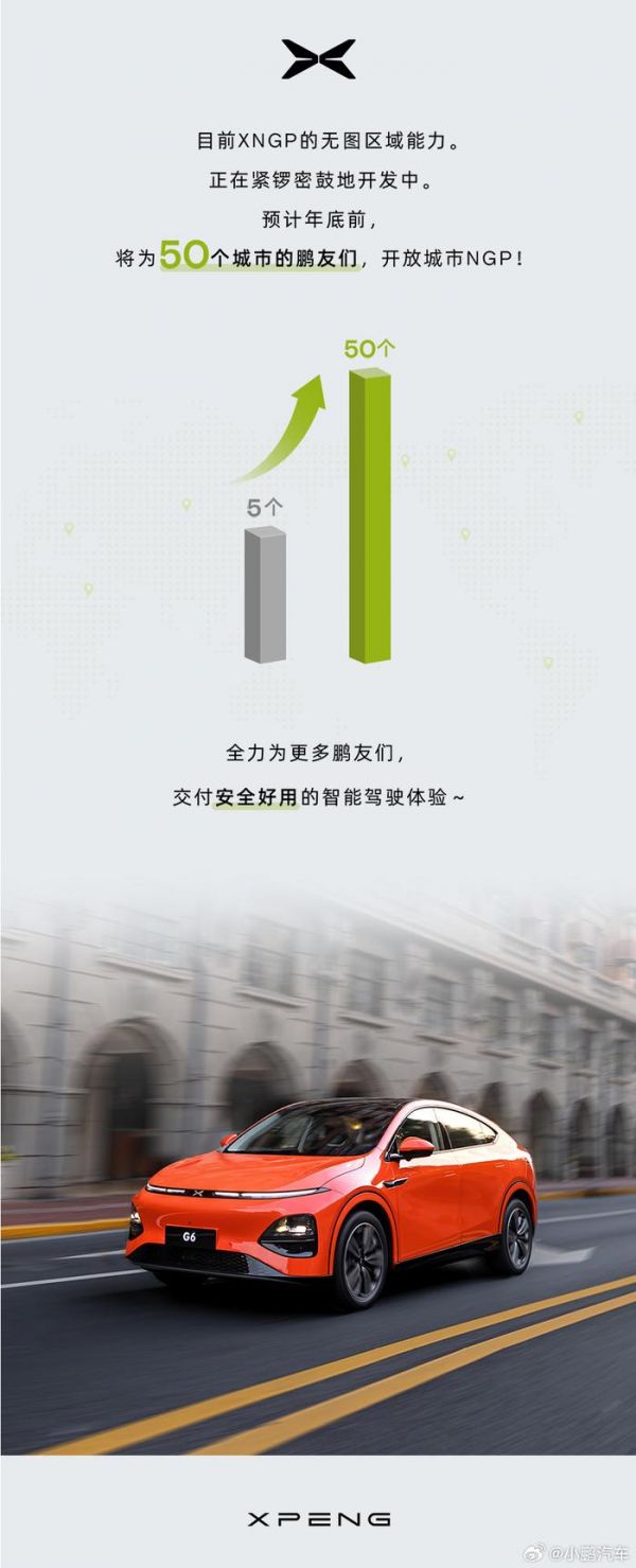 IT之家 8 月 14 日消息,小鹏汽车今日上午通过微博宣布,预计到今年年底,将会有 50 座城市实现 XNGP 的落地。此外,XNGP 的无图区域能力也正在开发中。