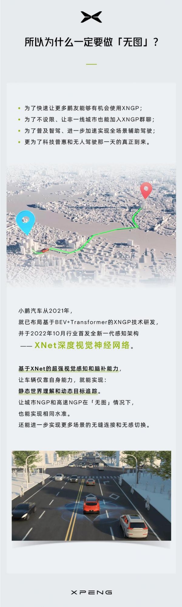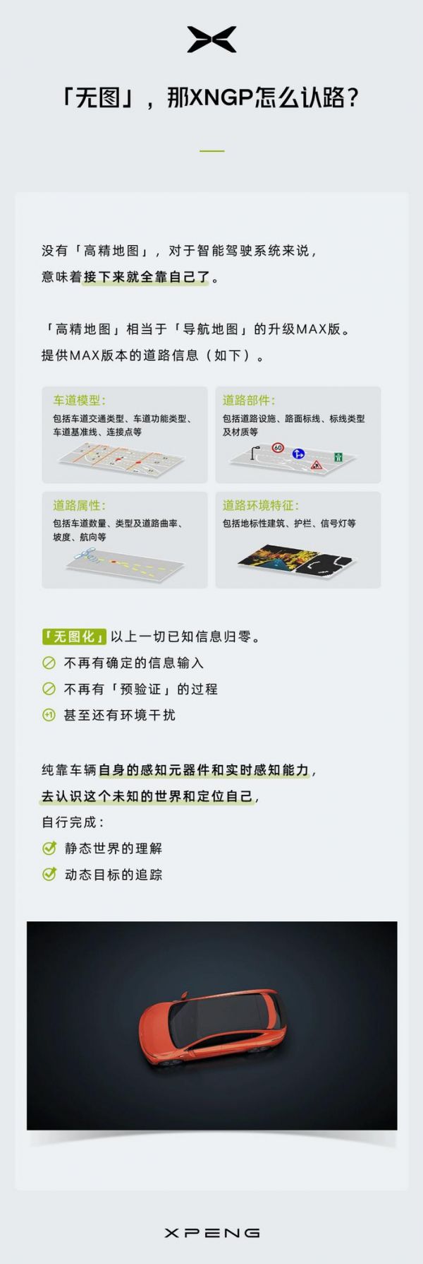 而 XNGP 的无图化,指的是在不再有确定信息输入和预验证过程并有环境干扰状态下,完全依靠车辆自身感知元器件、实时感知能力来完成的辅助驾驶。据称,XNGP 无图区域能力的开发是为了提高用户和城市的普及率、进一步实现全场景辅助驾驶,并为无人驾驶铺路。