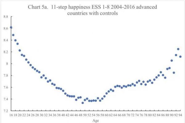 (图源:Blanchflower, D. G., & Oswald, A. J. (2008). Is well-being U-shaped over the life cycle? Social Science and Medicine, 66, 1733–1749.)