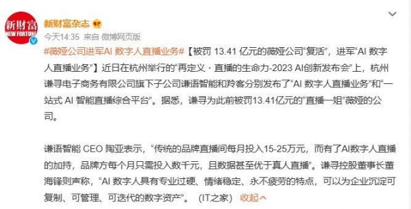 图源:新财富杂志微博据谦寻介绍,薇娅本人也深度参与了AI数字人等新业务中,经常总结自己的直播素材和话术,用于数字人主播的调试与进化。