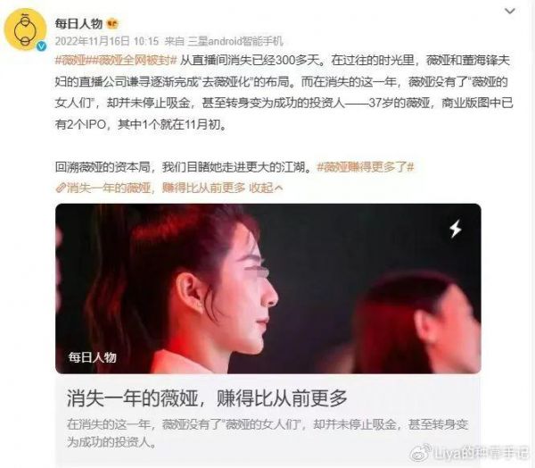 图源:@每日人物微博尤其是从直播带货与巨子生物、德尔玛结缘到华丽转身完成“股东”的身份转变,高达数亿元的IPO资本收益显然不亚于薇娅在直播带货行业取得的任何高光时刻。 从台前到幕后,从网红到投资人,多级身份的转变既证明了薇娅眼光的毒辣,也让薇娅的多面性尽展无疑。 这显然不是个单纯踩中时代红利的“暴发户”故事,而是一个对流量、对商业细致观摩与拿捏中完成一次次华丽跳跃的精彩样本。