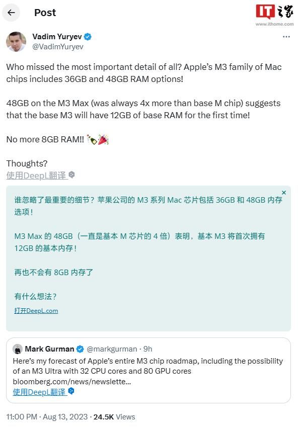稍晚些时候,另一名苹果报料人 Vadim Yuryev 转发 Gurman 的推文时作出如下补充:“是不是有个最重要的细节被忽略了?M3 Max 配备了 48GB 的内存,这意味着基本版 M3 将首次配备 12GB 内存,再也不会有 8GB 内存了!有什么想法吗?”
